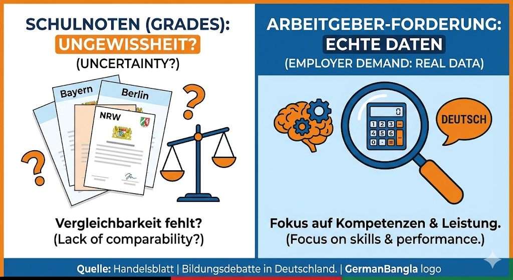 সম্প্রতি জার্মানির বড় বড় চাকরিদাতারা (Employers) প্রশ্ন তুলেছেন স্কুলের গ্রেডিং সিস্টেমের বিশ্বাসযোগ্যতা নিয়ে। আপনি যদি বাভারিয়া (Bavaria) থাকেন আর আপনার আত্মীয় যদি বার্লিনে (Berlin) থাকেন—তবে দুজনের বাচ্চার রেজাল্ট কার্ডের ওজন কি সমান? এই প্রশ্নের উত্তর এবং বিস্তারিত বিশ্লেষণ থাকছে আজকের ব্লগে।